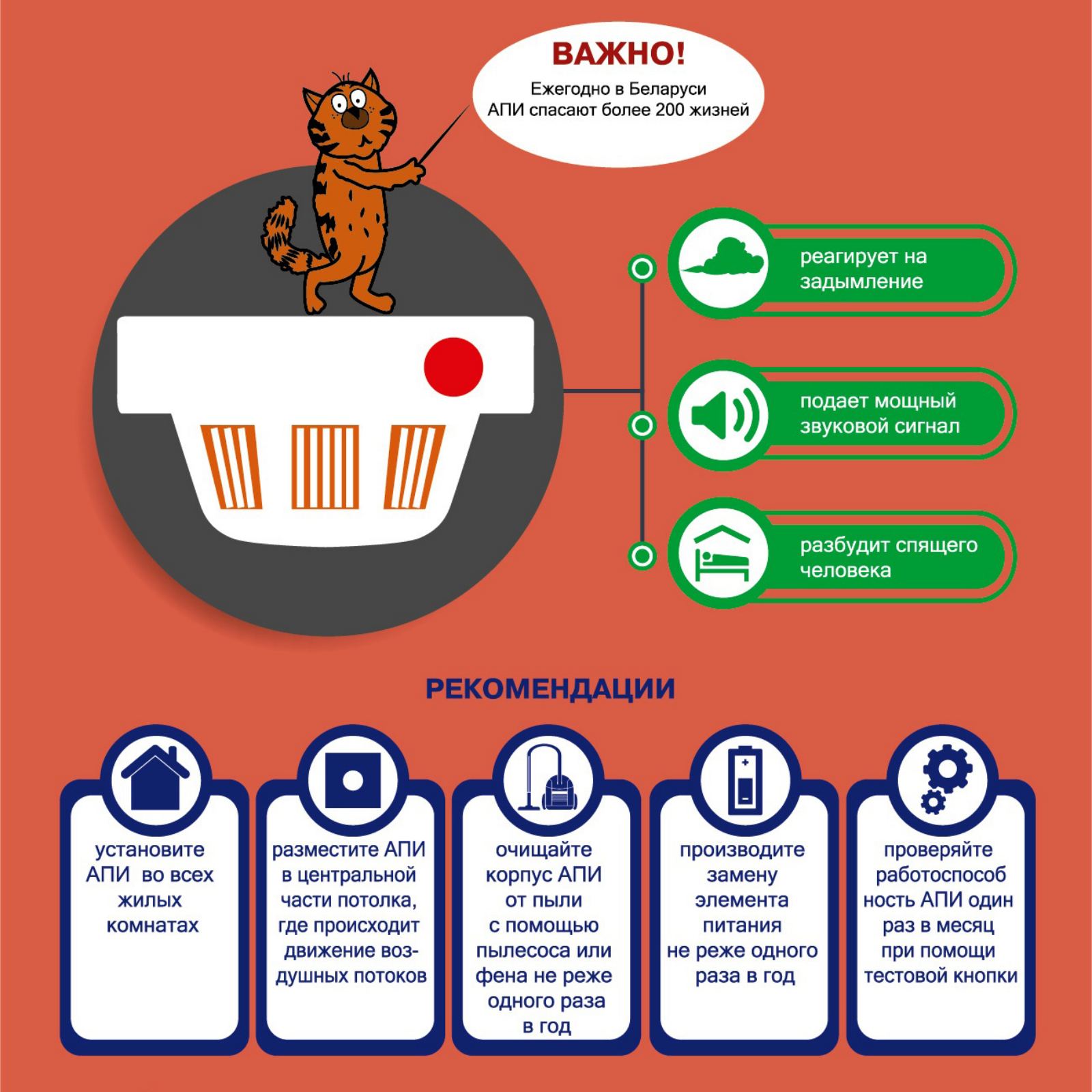 Анализ пожаров показывает, что наибольшее их число происходит в ночное время суток. Для спящего человека достаточно несколько минут нахождения в задымленном помещении, чтобы получить критическую дозу угарного газа. Обнаружить пожар на ранней стадии (при появлении дыма) способен автономный пожарный извещатель (АПИ).