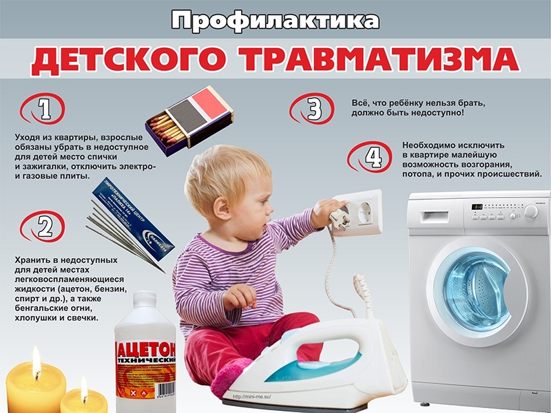Стеклянные бутылки, ножи, лезвия и ножницы также необходимо держать в недоступных для детей местах. Старших детей надо научить осторожному обращению с этими предметами. Объяснять детям, что бросаться камнями и другими острыми предметами, играть с ножами или ножницами очень опасно. Электрические розетки нужно закрывать, чтобы предотвратить электротравму у ребёнка. Электрические провода должны быть не доступны детям – обнажённые провода предоставляют для них особую опасность.