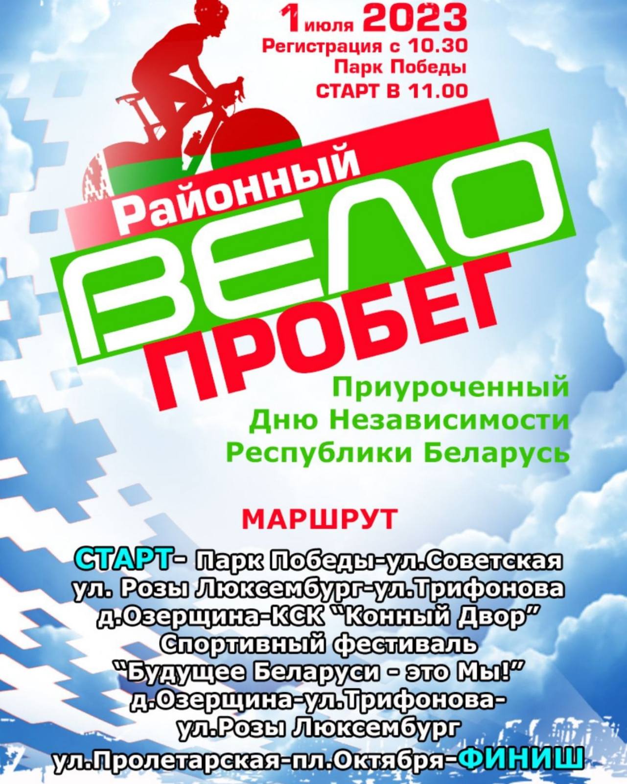 Внимание! 1 июля 2023 года состоится районный велопробег, приуроченный Дню Независимости Республики Беларусь. Начало регистрации с 10.30, старт в 11.00. . Приглашаем всех желающих принять участие.